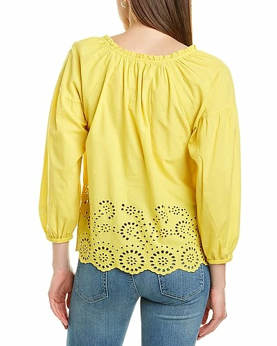 - 3/4-Sleeve Split Neck Top in goldenrod with ruffle neckline, dropped-shoulder sleeves, and eyelet scallop hem