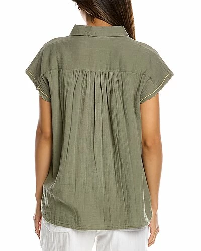 - Boxy Button Down Shirt in aloe with double gauze design, raw edge trim, and shirttail hem