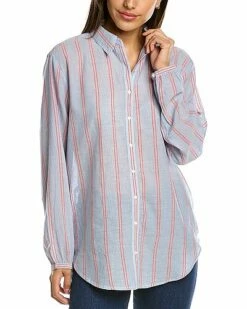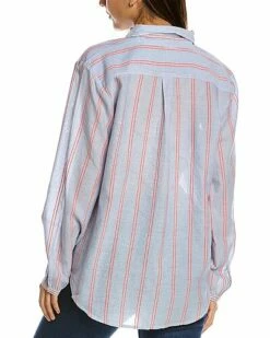 - Boyfriend Button Down Shirt in tide stripe with slight dropped-shoulder sleeves, button cuffs, box pleat at back, and shirttail hem