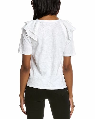 - Elbow Sleeve Ruffle Top in white with relaxed look that skims the body