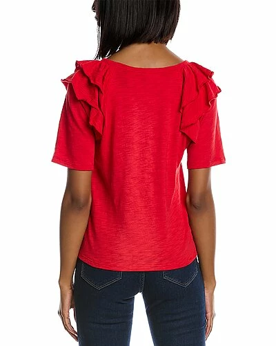 - Elbow Sleeve Ruffle Top in salsa with relaxed look that skims the body