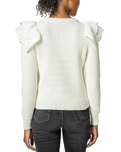 - Eyelet Trimmed Crewneck Sweater in ivory with eyelet trim ruffles on sleeve