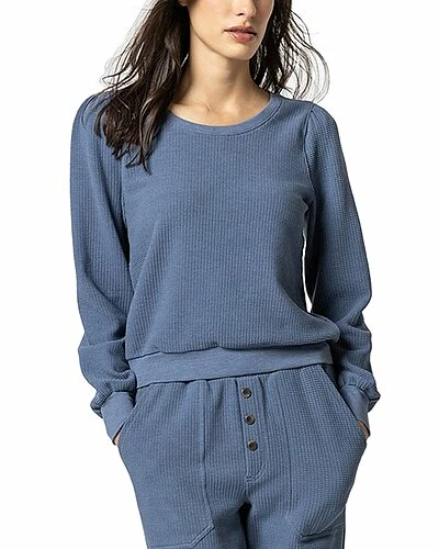 - Full Sleeve Scoop Sweater in indigo with long sleeve, banded bottom, waffle texture, ribbed trims