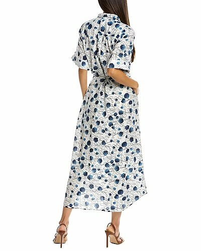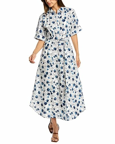 - Maxi Shirtdress in blue vine print with waist tie, side seam pockets, and box pleat at back