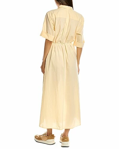 - Maxi Shirtdress in shell with waist tie, side seam pockets, and box pleat at back