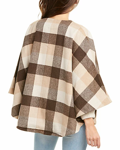 - Plaid Wool-Blend Cape Jacket in sable with open sides with snap closure and two front pockets