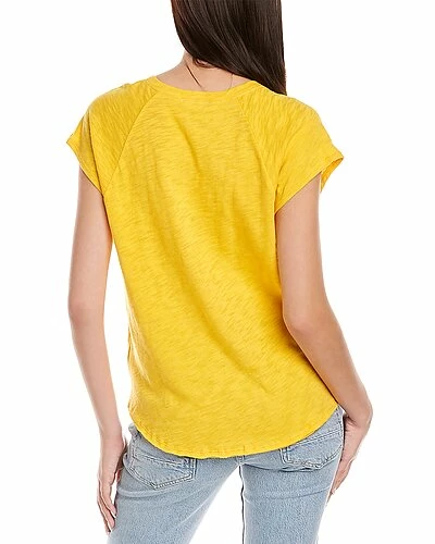 - Raglan T-Shirt in gold with V-neck, contrast stitching, and raw edge shirttail hem