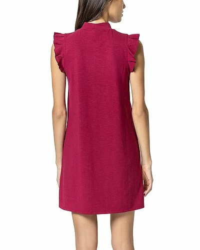 - Ruffle Sleeve Mock Neck Dress in currant with slub texture, mock neck, yoke seam with shirring, ruffle detail at sleeve, above the knee