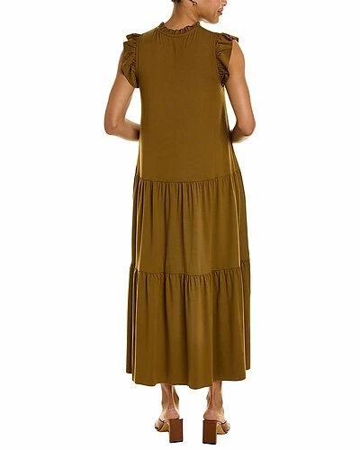 - Ruffle Trim Peplum Maxi Dress in toffee with ruffle trim at neck and sleeve, peplum