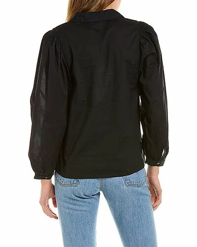 - Shirred Sleeve Top in black with 3/4-length sleeves and button cuffs