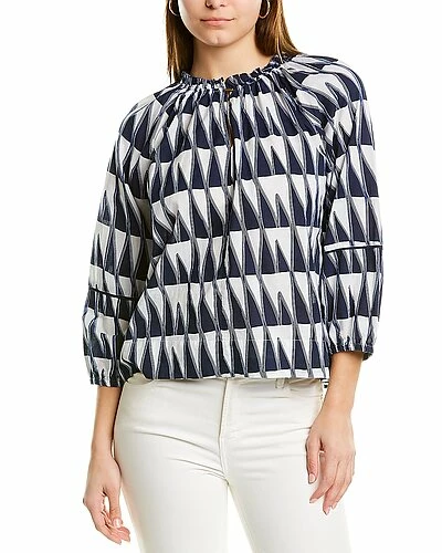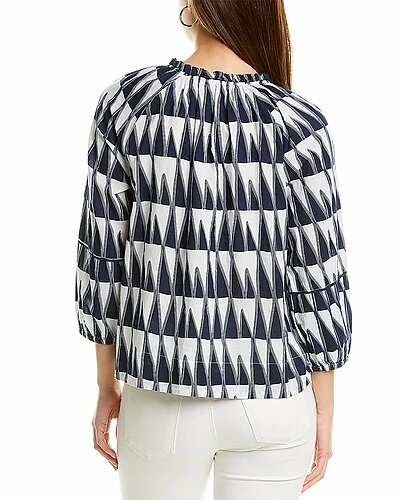 - Split Neck Blouse in navy print with ruffle neckline, 3/4-length sleeves, and elasticized cuffs